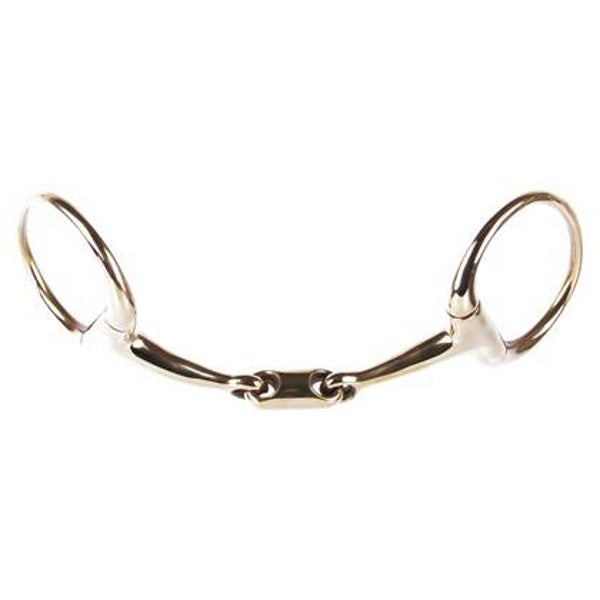 Dubbel gebroken bustrens met o-link, geheel uitgevoerd in GB (koperkleurig). Dikte mondstuk 13mm, doorsnee ringen 70mm.